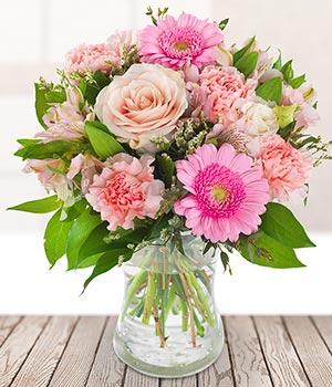 The perfect pretty pinks bouquet. Made up of pink roses, germini and carnations all complemented with seasonal foliage.