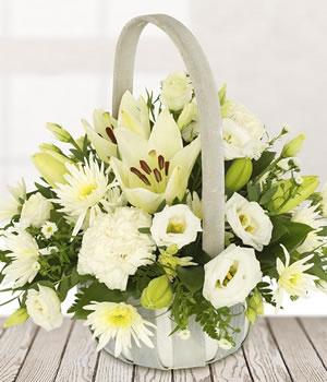 A beautiful basket of mixed white flowers, including white lilies and blooming carnations and other complimentary flowers. Subtle yet classic basket arrangement perfect for all occasions.
