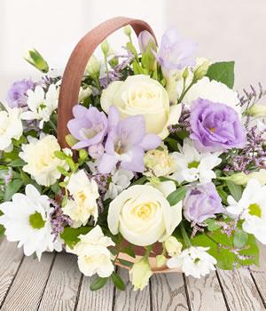 A mixture of lilac freesia, spray carnations, and seasonal foliage make up this delightful wooden basket. Sent in a special box designed to protect the stems and provide a pleasant unboxing experience.