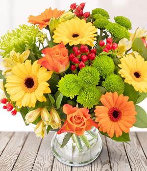 A glorious mix of orange blooms with bursts of pink, purple and green stems make up our beautiful Sunrise bouquet. Containing a mix of roses, germini, alstroemeria, carnations, and foliage to complement.