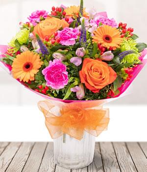 A bouquet with a real WOW factor! This bold and beautiful hand-tied bouquet contains orange and pink seasonal flowers and foliage.
