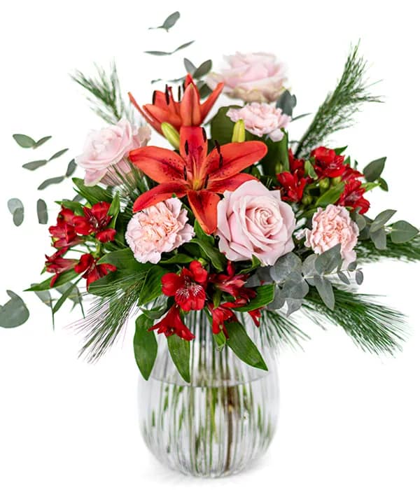 A beautiful hand-tied bouquet including soft pink roses, red alstroemeria, red lilies, pale pink carnations, and seasonal foliage. Lovingly prepared by a florist and hand-delivered to the lucky recipient. Send Christmas flowers that lift the spirits with these magical blooms.