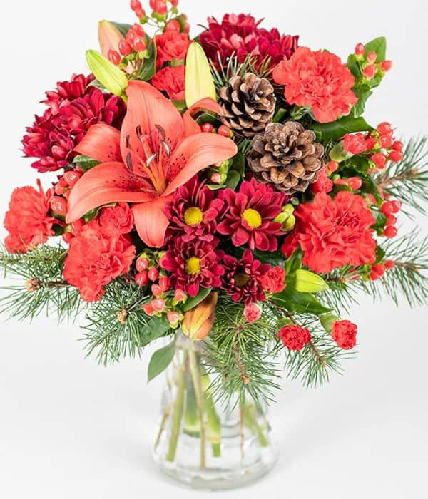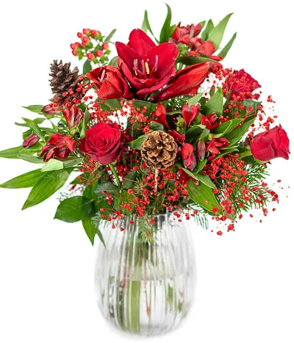 Bring the charm and warmth of Christmas into your loved one’s home with our Festive Pines & Petals bouquet. Featuring radiant red roses, alstroemeria, hypericum, vibrant amaryllis, and touches of seasonal greenery. This enchanting yet affordable bouquet fills any room with holiday cheer. Lovingly prepared by a local florist and hand-delivered to your loved ones’ door.